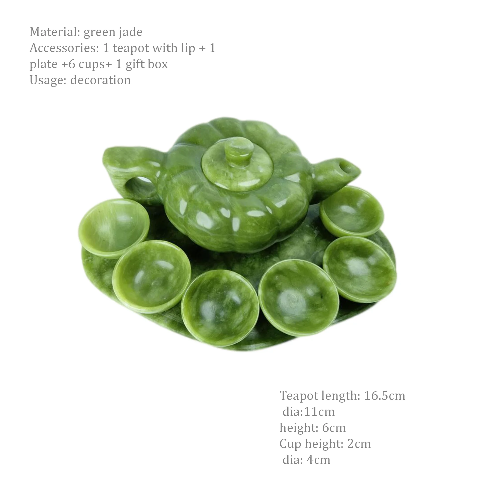 The jade teapot material is green xiuyan jade, xiuyan jade is a material which is 100% natural jade . The xiuyan jade is from liaoning province, and China. The xiuyan jade have many elements which are good for human health